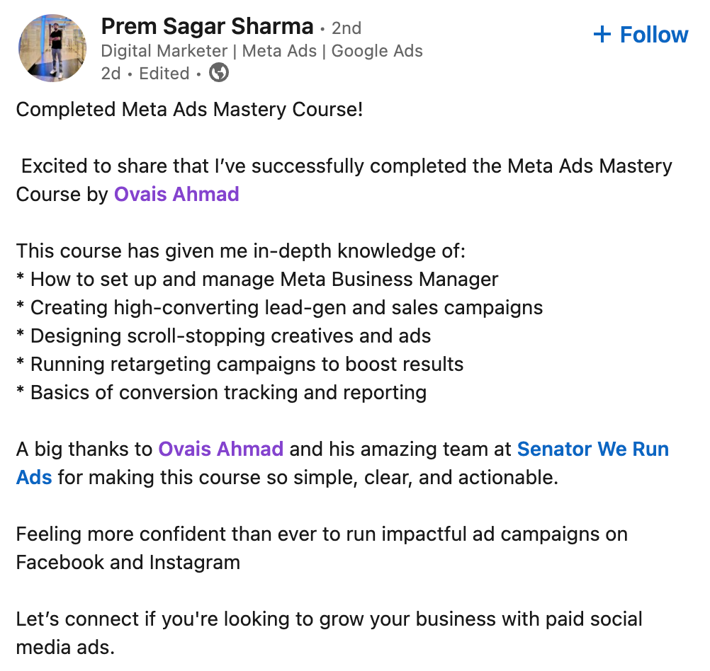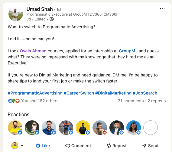 I have worked with Ad Tech companies like Google, Agencies like Initiaitive, Boopin and client side with companies like Delivery Hero, Talabat, Foodpanda, Etisalat, Nissan, Prime Ministers Office Dubai, Emirates Hospitals, Abu Dhabi Ports